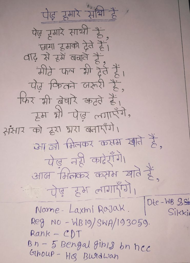Name-Laxmi Rajak Reg-WB19/SWA/193059 Rank- CDT Battalion-5 Bengal girls Battalion NCC Group-HQ Burdwan Dte-WB & Sikkim College Name-M.U.C Women's College