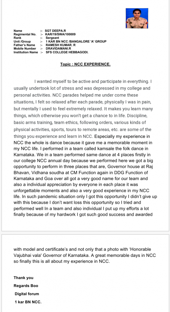CDT Asha Ramachandran from 1 KAR ARMD SQN TP-3 BLR/B/group - St Joseph's college.