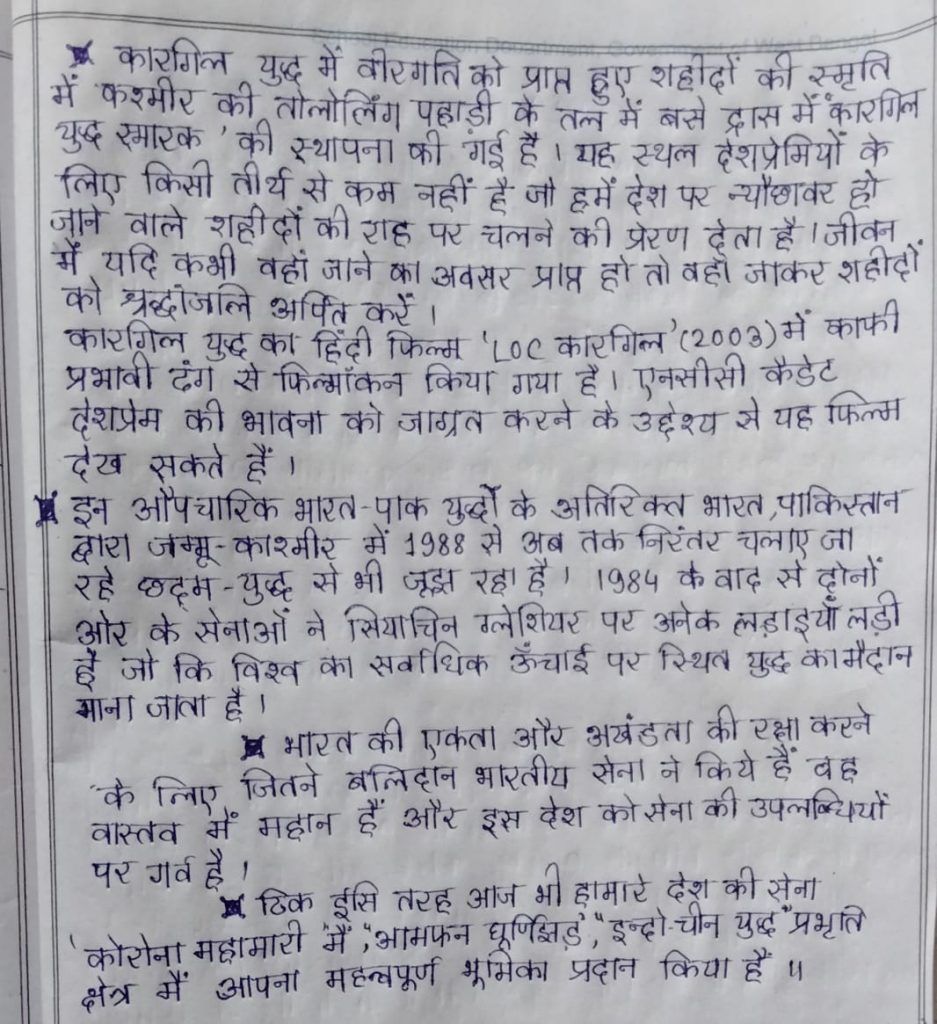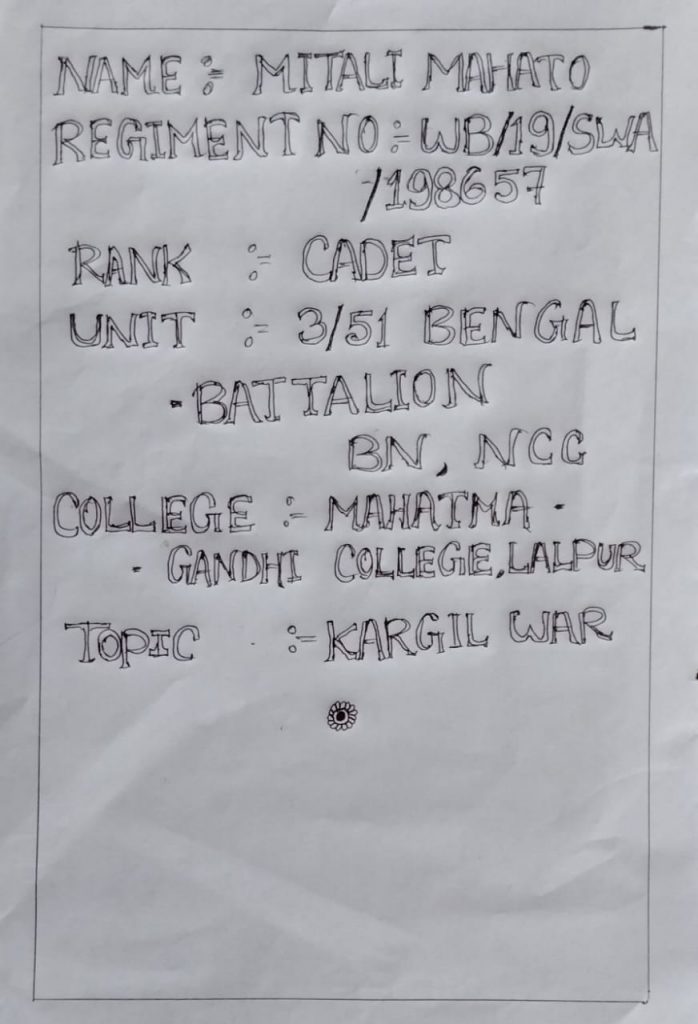 NAME-MITALI MAHATO REGIMENT NO-WB/19/SWA/198657 RANK-CADET UNIT-3/51 BENGAL BATTALION BN,NCC SUBJECT-KARGIL WAR(ARMY ARTICLE)