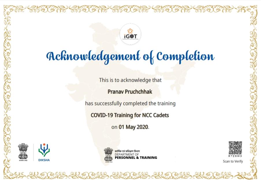 I am LC Pranav Pruchchhak, Student of Darshan University & No. 8 Guj Naval Unit NCC - Jamnagar. I Successfully Completed the 'Covid -19 Trg. for NCC Cadets' on 01 May 2020.