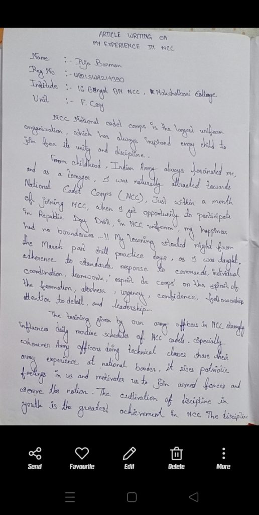 Name cdt Puja bouri(WB21SWA198850) from pkmv college sarabari, disct of paschim Bardhaman, West Bengal, India.unit-51bn bengal.