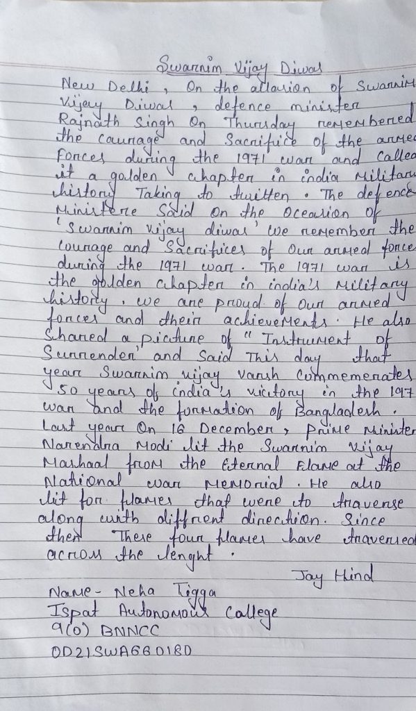 Cadet Neha tigga Ispat autonomous collage 9(o)BN NCC OD21SWA660180