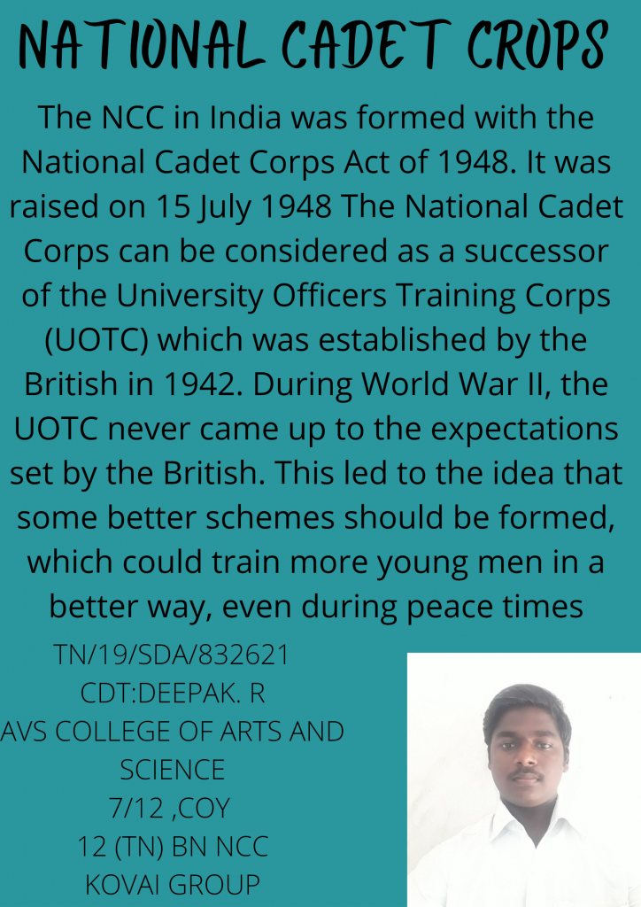TN/19/SDA/832621 CDT:DEEPAK. R AVS COLLEGE OF ARTS AND SCIENCE 7/12 ,COY 12 (TN) BN NCC KOVAI GROUP DTE:TN,P&AN