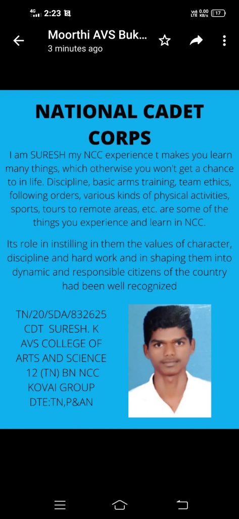 TN/19/SDA/832625 CDT:k.suresh AVS COLLEGE OF ARTS AND SCIENCE 7/12 ,COY 12 (TN) BN NCC KOVAI GROUP DTE:TN,P&AN
