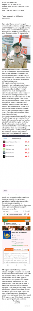 I cadet Manika kumari from govt women's college m.a road srinagar of 1J&K girls bn ncc Srinagar. Today am sharing my ncc online experience.