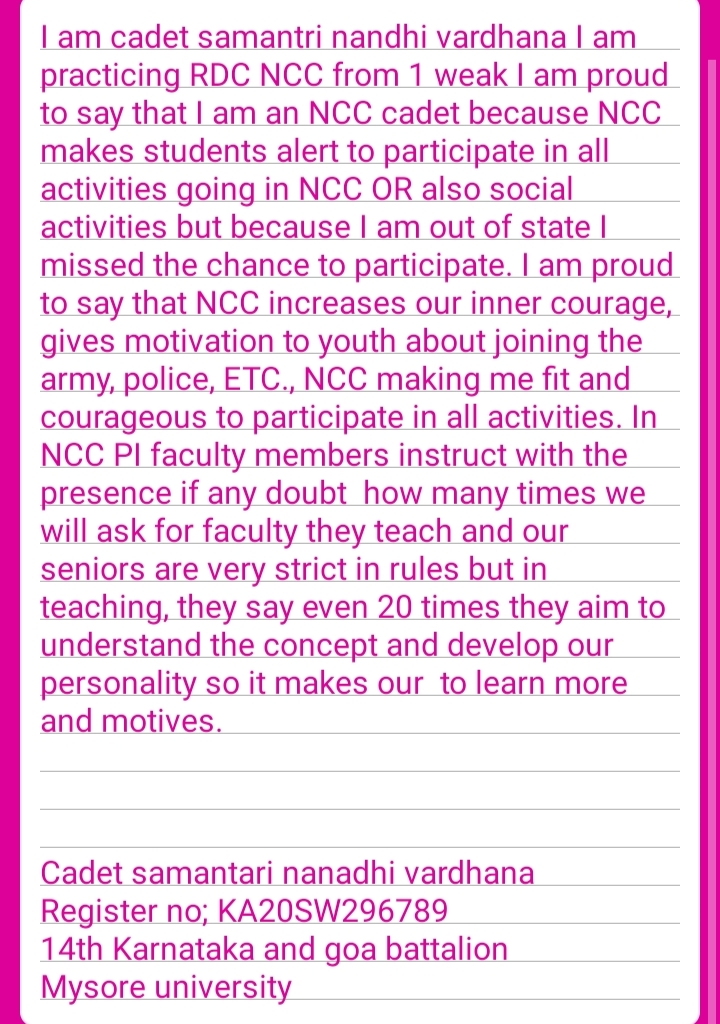 Cadet samanthari nandhi vardhana 14th Karnataka and goa battalion Jss college for women Mysore Mysore University.