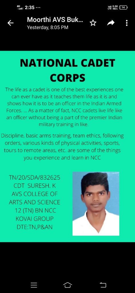 TN/20/SDA/832612 CADET MOORTHI.S AVS COLLEGE OF ARTS AND SCIENCE SALEM KOVAI GROUP 12TN BN NCC DTE-TN P and AN
