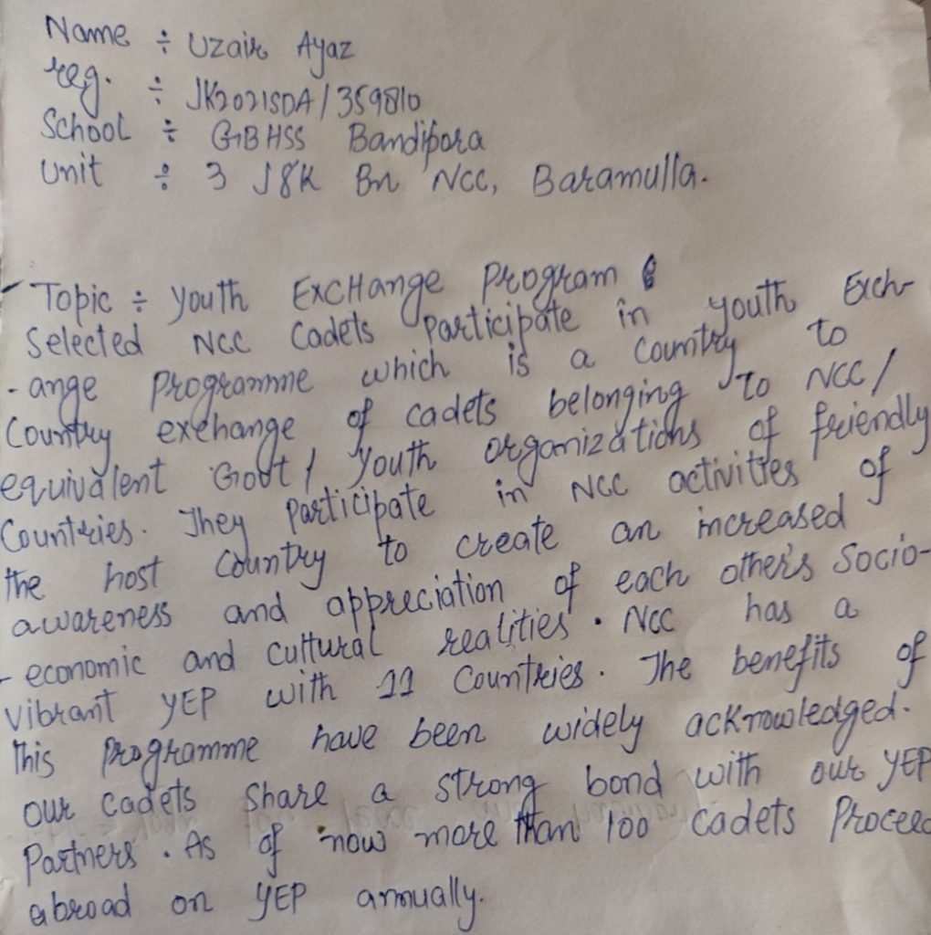 NAME: UZAIR AYAZ REG. : JK2021/359810 SCHOOL: GBHSS BANDIPORA UNIT : 3 J&K BN NCC BARAMULLA