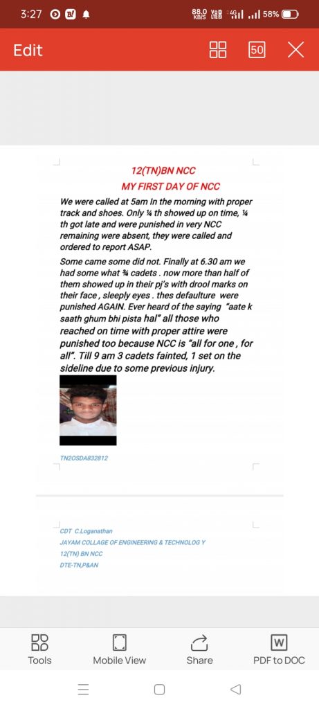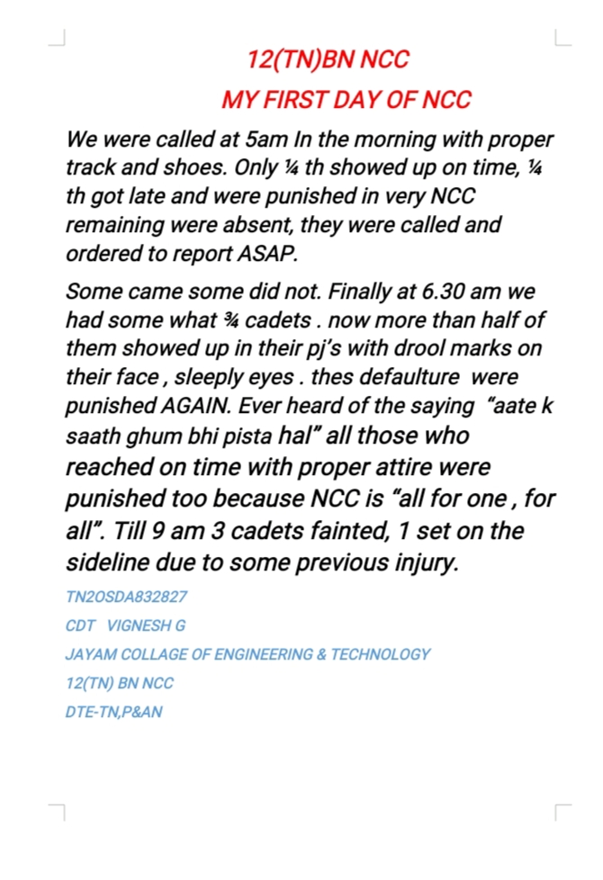 I am Cadet L.kavitha TN20SWA831884. Sacred heart College ,tirupattur, 12 (TN)BN NCC,Selam, Kovai group,DTE:TN,P &AN. This is about my ARTICLE.