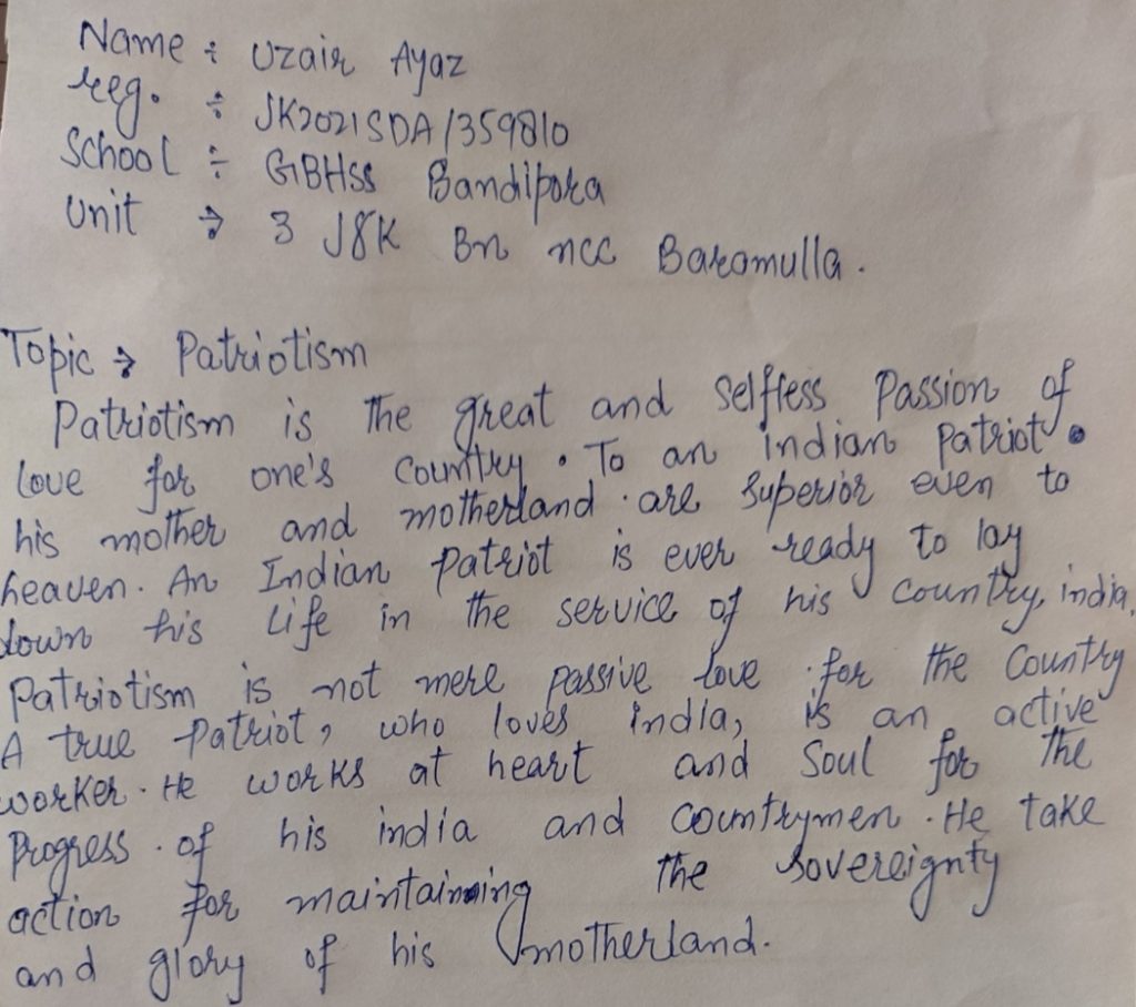 NAME : UZAIR AYAZ REG. : JK2021SDA/ 359810 SCHOOL: GBHSS BANDIPORA UNIT: 3 J&K BN NCC BARAMULLA