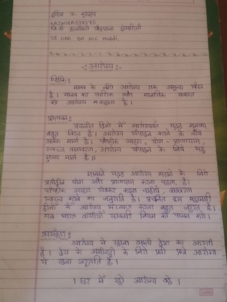 Hi IAM Harita kurgunda KARJW19A537275 28KAR BN NCC Hubli I write in article helth and higanic