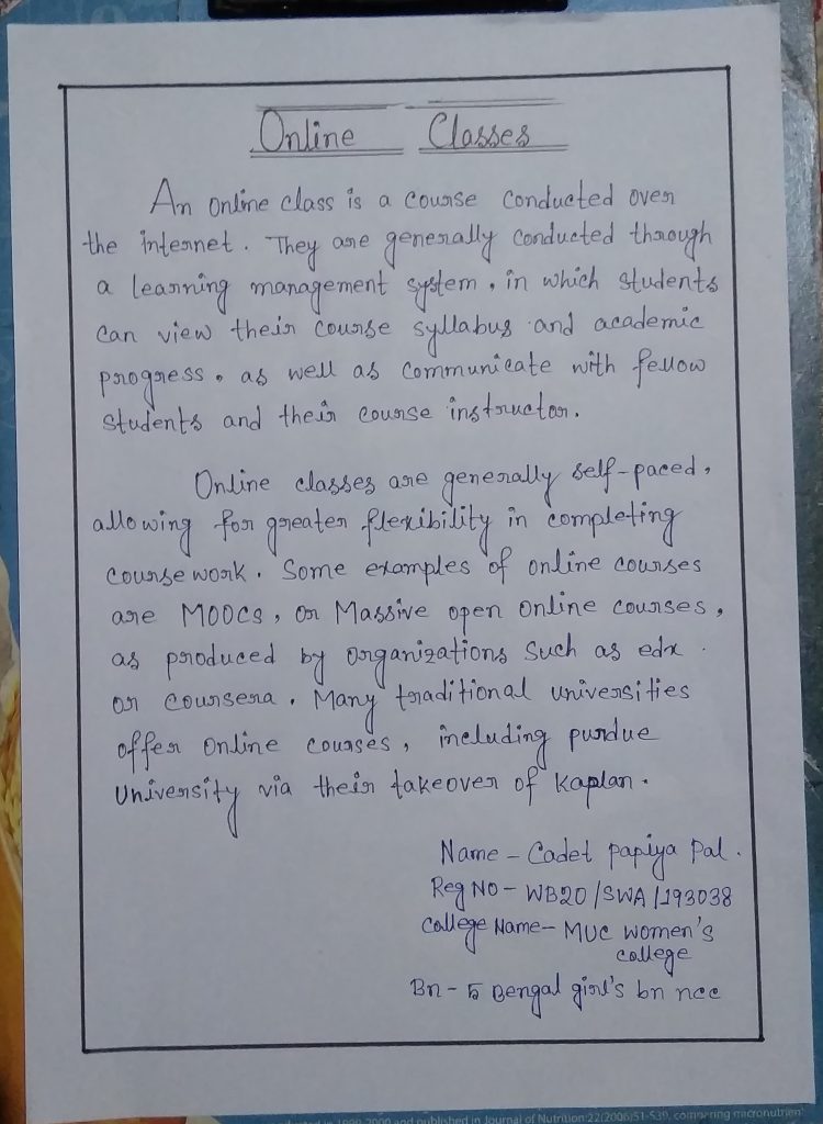Article Topic-Online Classes Name-Papiya Pal Reg-WB20/SWA/193038 Rank-CDT Bn-5 Bengal Girls Bn NCC Group-HQ Burdwan Dte- WB & Sikkim College Name- Burdwan MUC Women's College