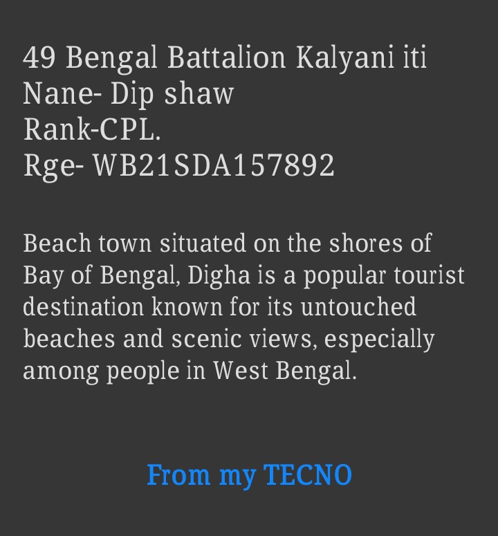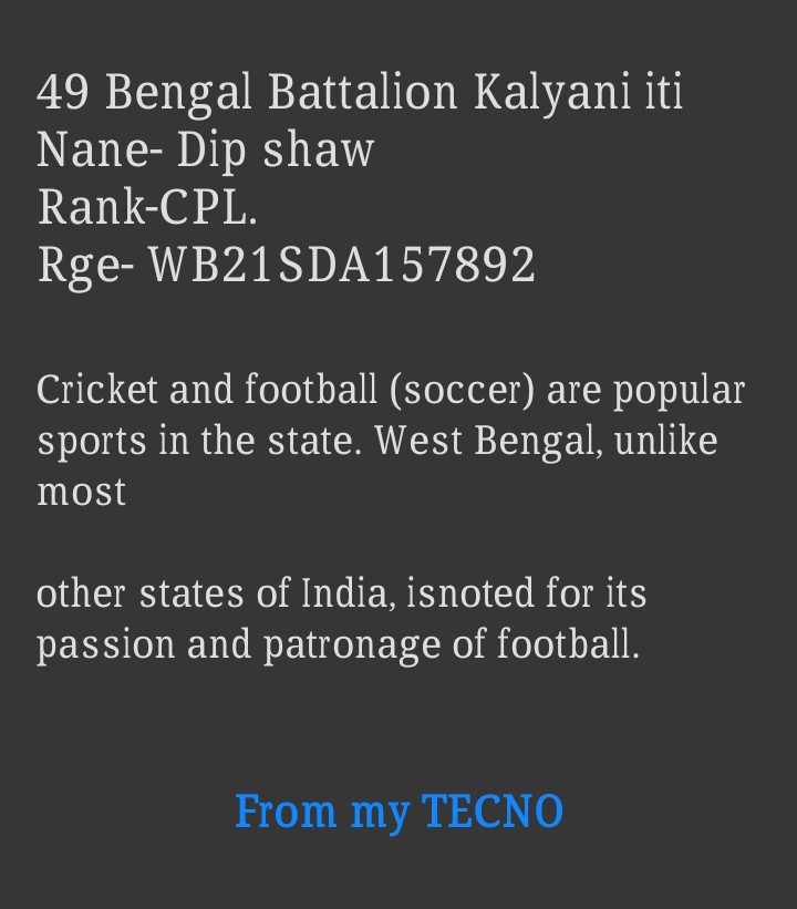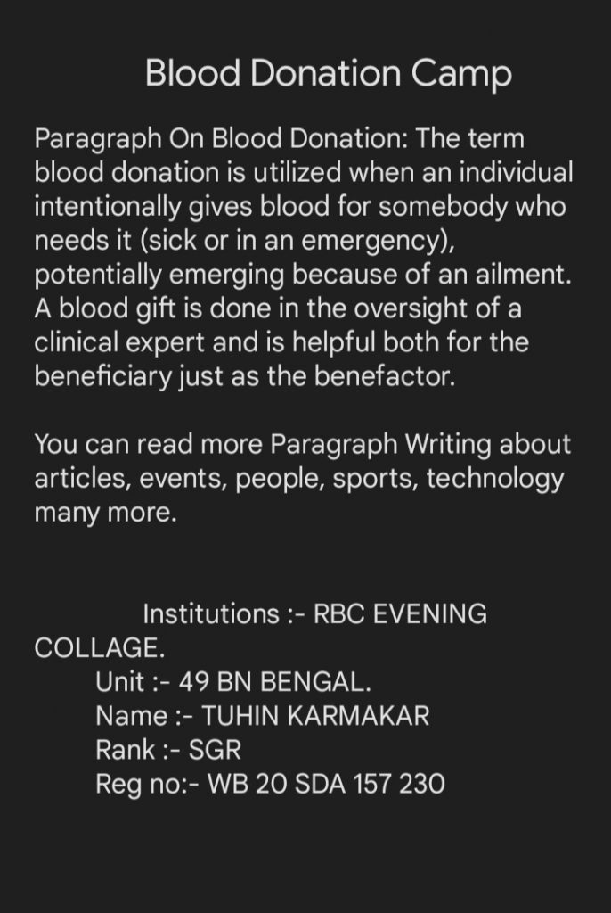 Institutions :- RBC EVENING COLLAGE. Unit :- 49 BN BENGAL. Name :- TUHIN KARMAKAR Rank :- SGT Reg no:- WB 20 SDA 157230