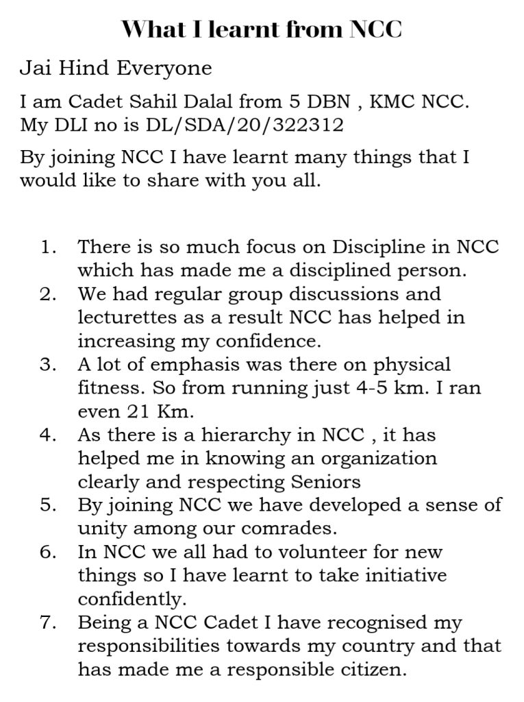 Jai Hind !! I am Cadet Sahil Dalal Kirorimal College NCC , 5DBN Here in the Article I wrote what I learnt from NCC