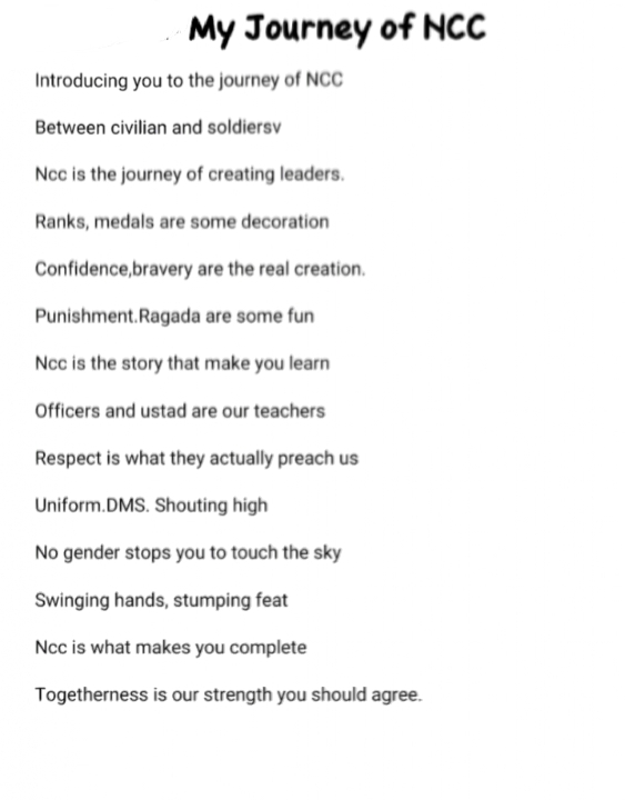 I like NCC. Iam very interested in NCC. My Ambition is Army
