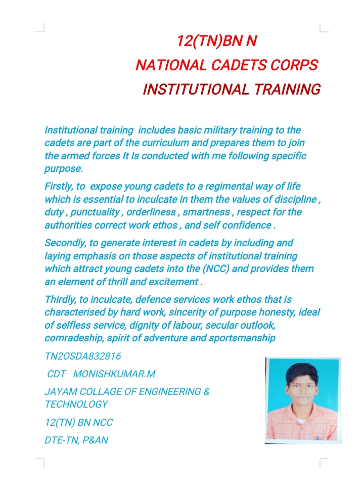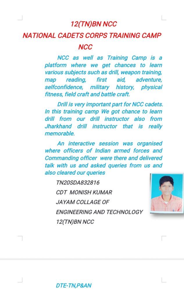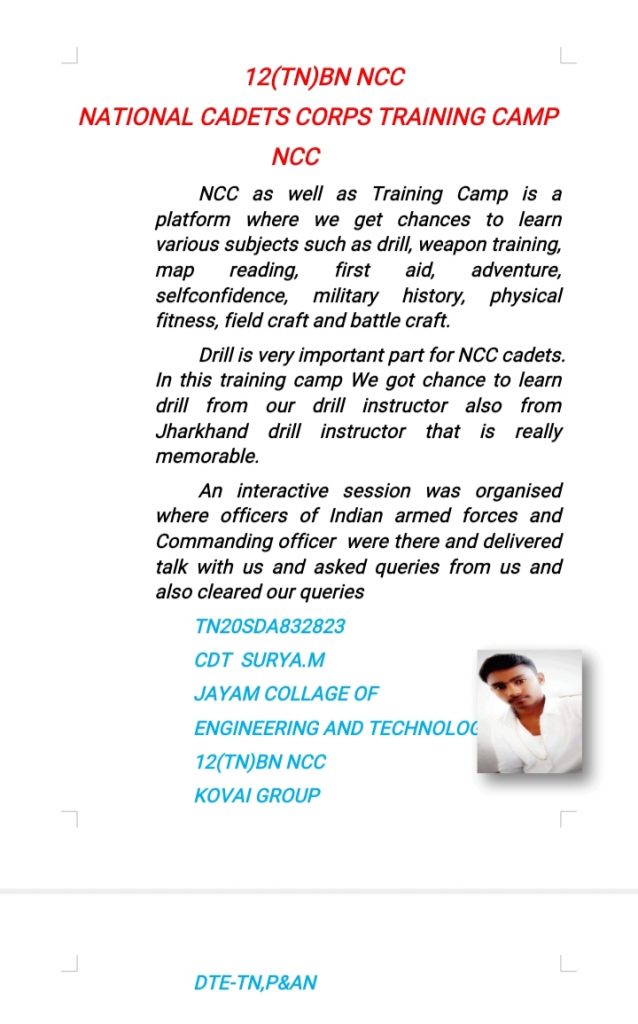 CDT: SATHIYA S TN19SWA832021 VC&RI NAMAKKAL 12 TN BN NCC KOVAI GROUP DTE-TN , P&AN