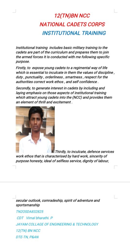 TN19SWA832645 CDT:P.MADHU ABS COLLEGE OF ARTS AND SCIENCE 7/12,COY 12(TN)BN NCC KOVAI GROUP DTE:TN,P&AN