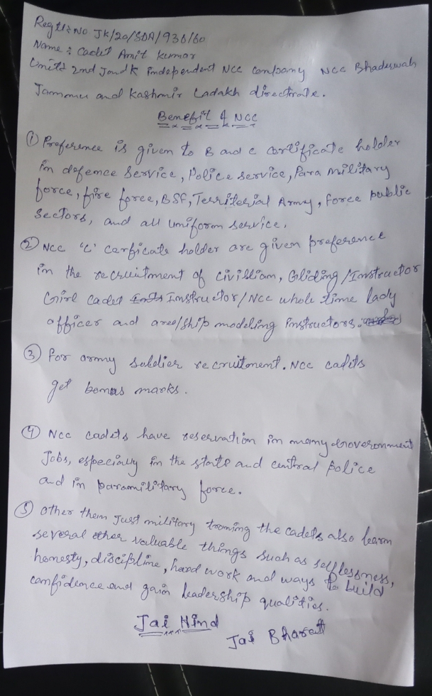 Cadet:-Amit Kumar Regt.no:-jk/20/SDA/930160 Unit:-2nd J&K (I) Coy NCC Bhaderwah College:-G.D.C Bhaderwah