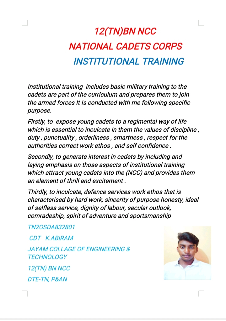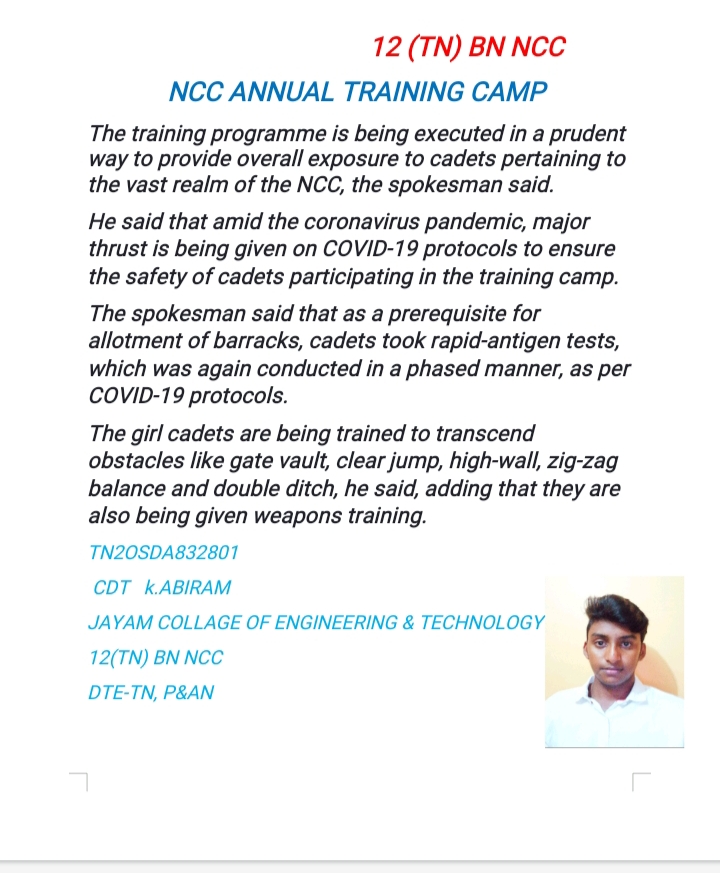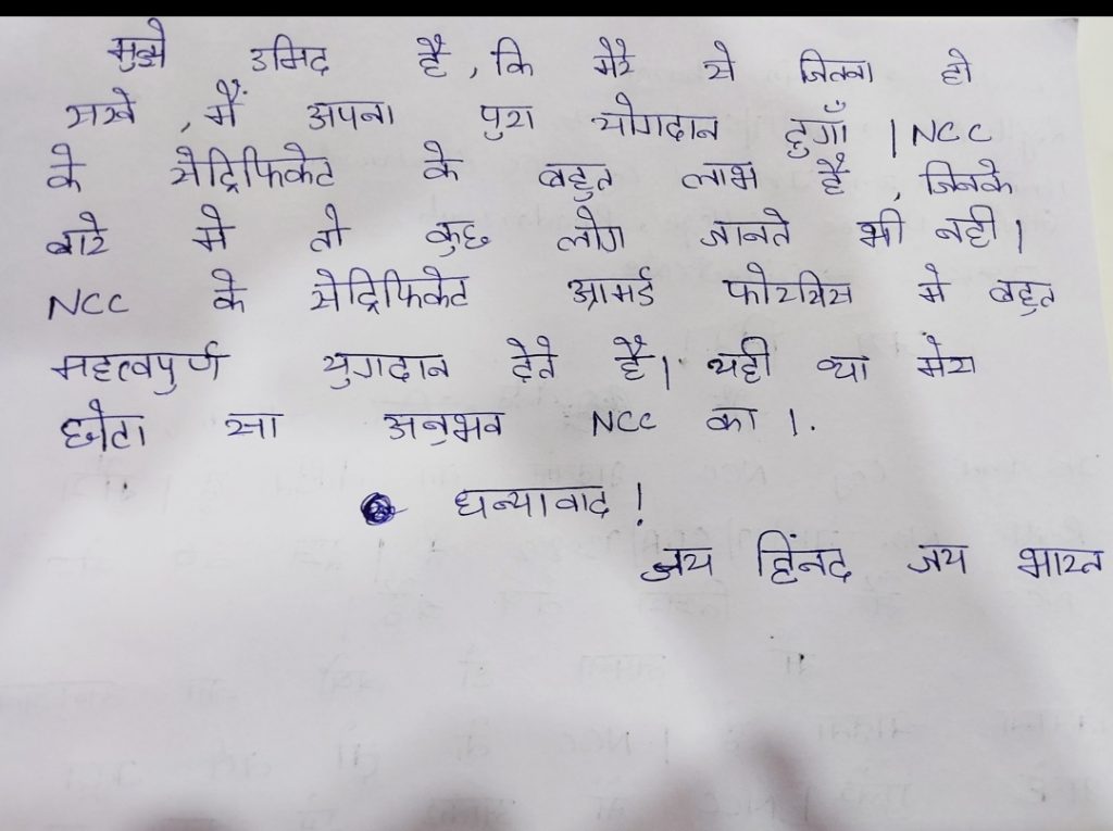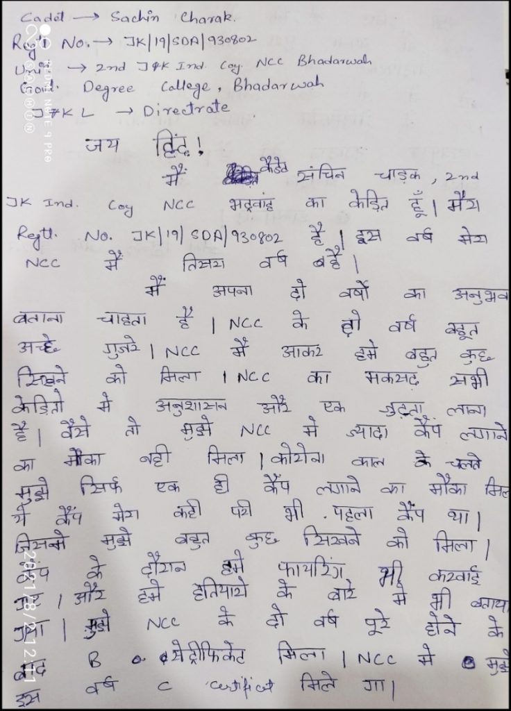 Cadet. Sahil Sharma Regtt. no. JK/21/SDA/930038 UNIT. 2ND J&K IND COY BHADERWAH