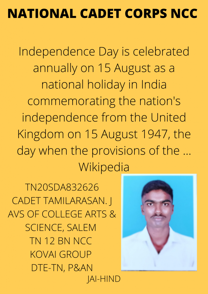 TN/20/SDA/832626 CDT:TAMILARASAN. J AVS COLLEGE OF ARTS AND SCIENCE 7/12 ,COY 12 (TN) BN NCC KOVAI GROUP DTE:TN,P&AN