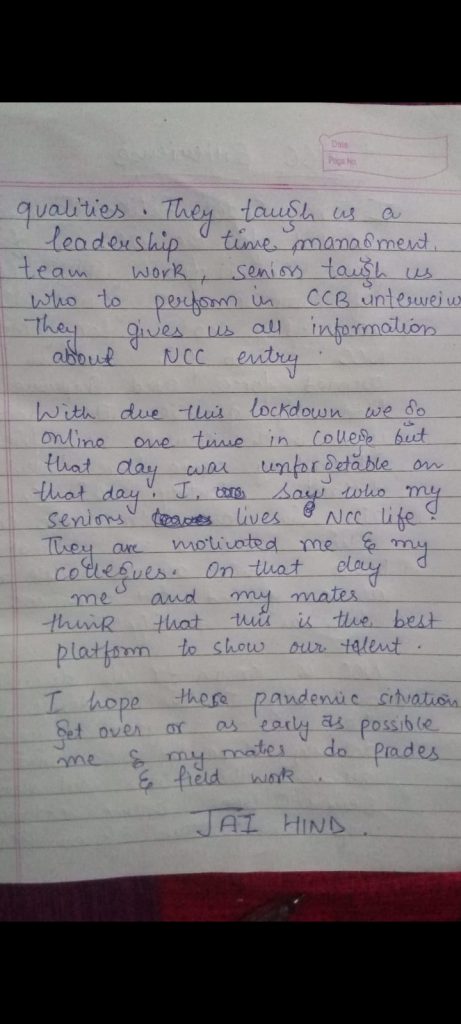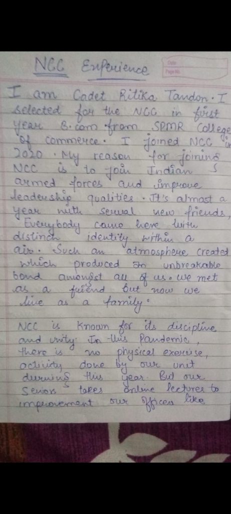 NCC experience written by Cadet Ritika Tandon of SPMR College of Commerce Jammu