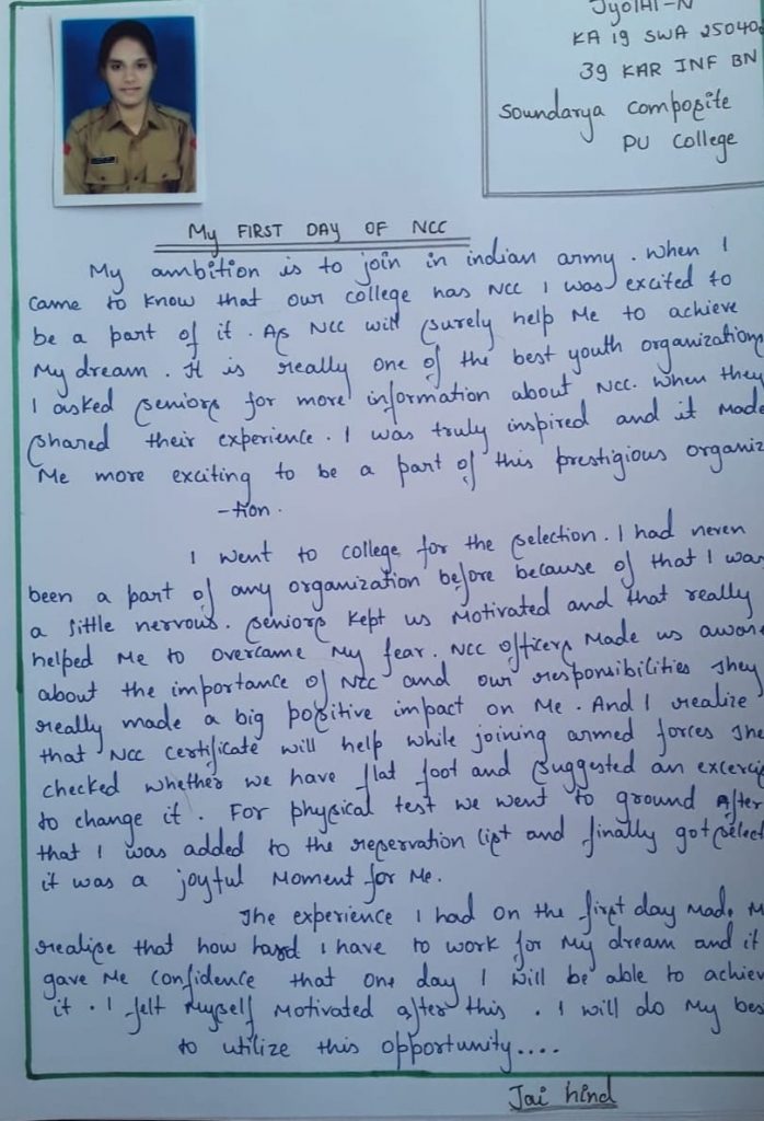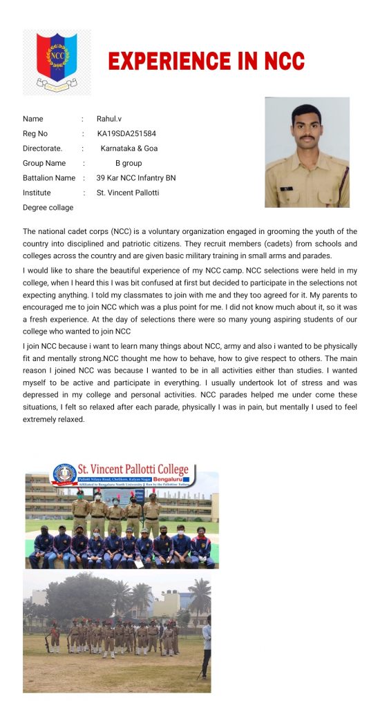 I Rahul.v, studying in st. Vincent pallooti degree collage, I'm proud to be part of NCC because NCC thought us many important thing in life and also it teaches us importance of army. once again I'm glad to be part of NCC