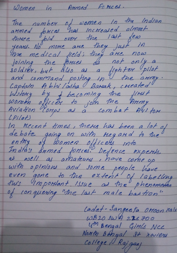 Cadet Neha kiran bara WB20SWA226690 St. Xaviers College, rajganj