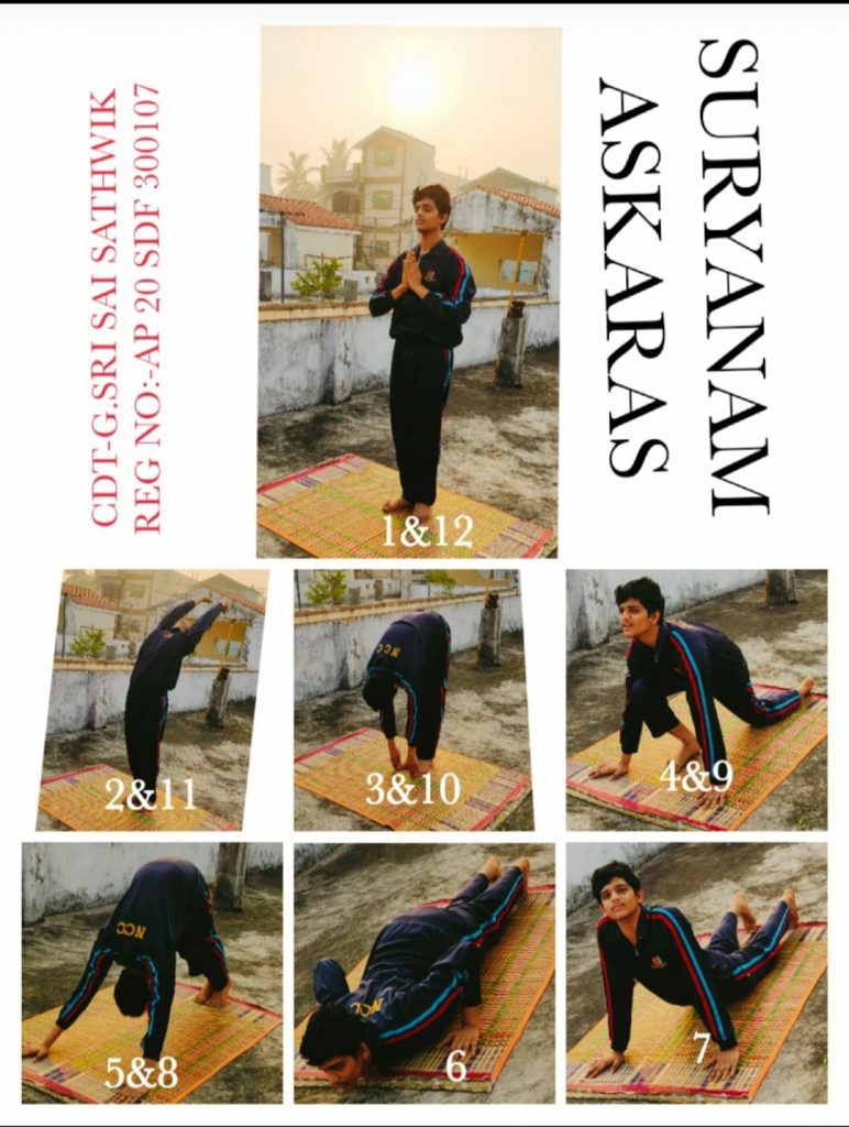 I am cadet G.Sri Sai Sathwik from 8(A)AIR SQN NCC, VIJAYAWADA, ANDHRA PRADESH. Doing yoga regularly improve our physical and mental health. "YOGA IS THE JOURNEY OF THE SELF, THROUGH THE SELF,TO THE SELF"