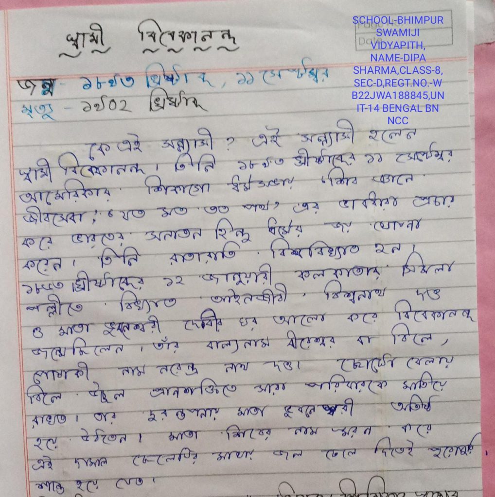 I am a NCC jwa cadet of 14 Bengal BN NCC. My Regimental number and name is WB 22jwa188845 , Dipa Sharma. My school name is Bhimpur Swamiji Vidyapith.
