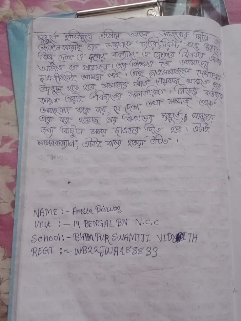I am a NCC jwa cadet of 14 Bengal BN NCC. My Regimental number and name is WB 22jwa188833 , Arpita Biswas. My school name is Bhimpur Swamiji Vidyapith