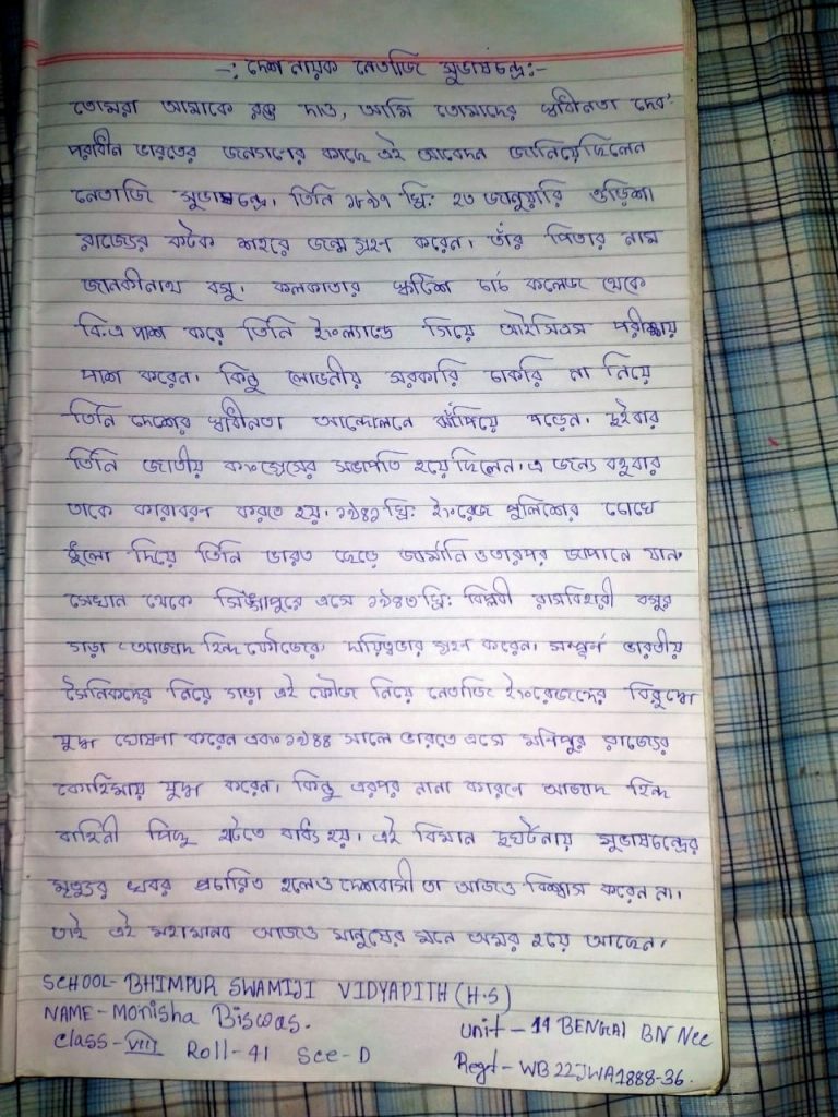 I am a NCC jwa cadet of 14 Bengal BN NCC. My Regimental number and name is WB 22jwa188836 , Monisha Biswas. My school name is Bhimpur Swamiji Vidyapith.
