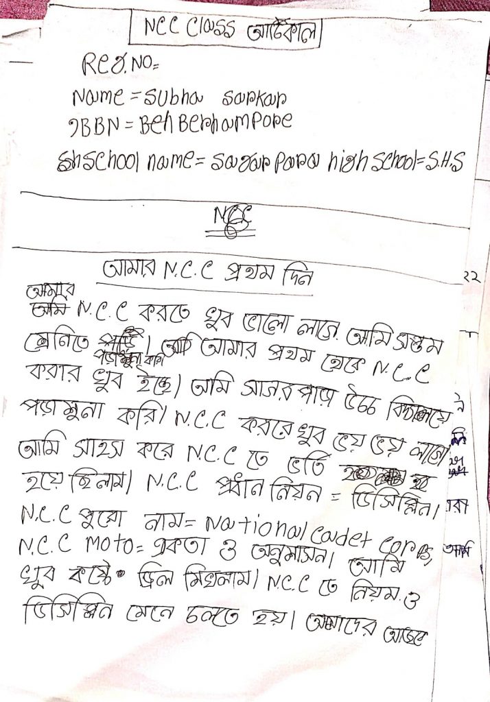 I am a NCC jwa cadet of 14 Bengal BN NCC. My Regimental number and name is WB 22jwa188845,Dipa Sharma. My school name is Bhimpur Swamiji Vidyapith.