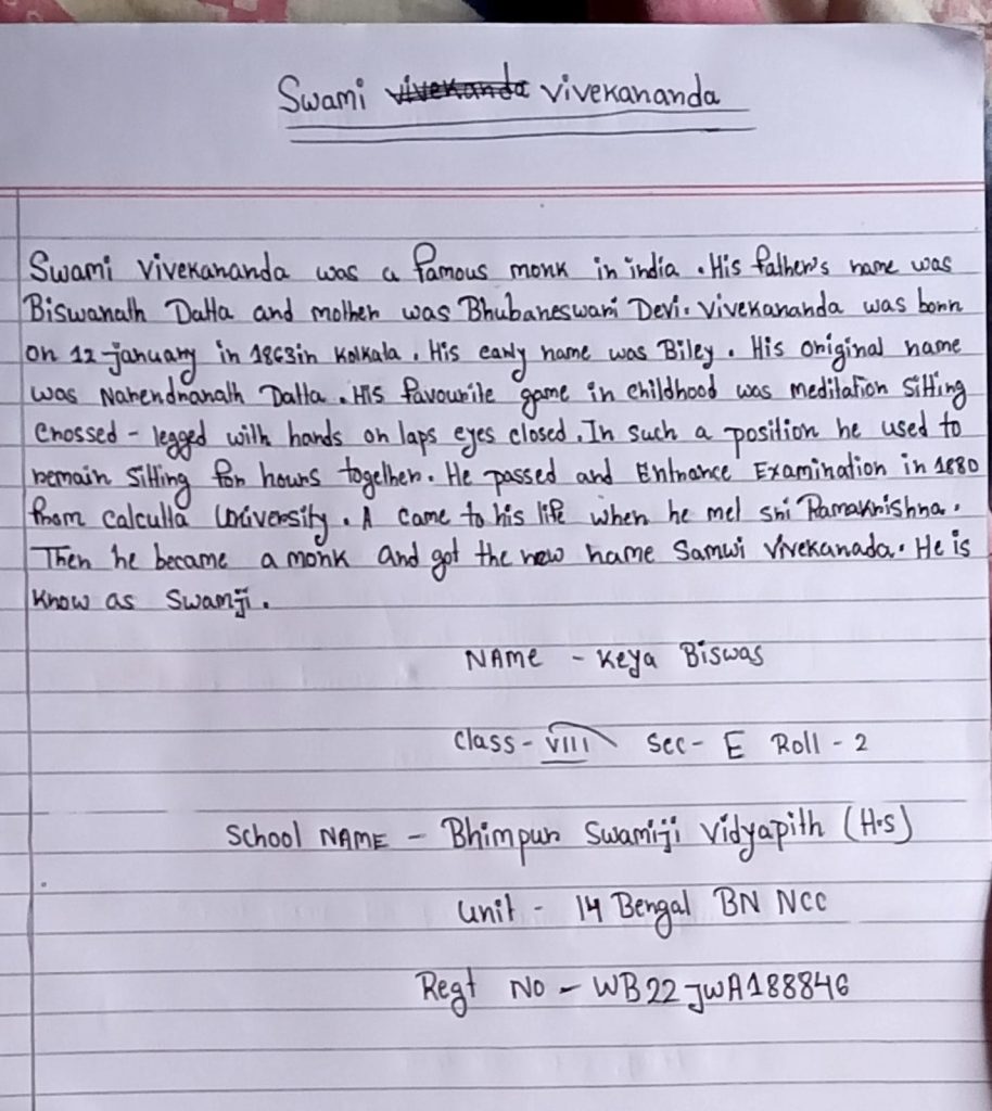 I am a NCC jwa cadet of 14 Bengal BN NCC. My Regimental number and name is WB 22jwa188846,Keya Biswas. My school name is Bhimpur Swamiji Vidyapith.