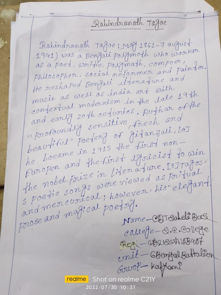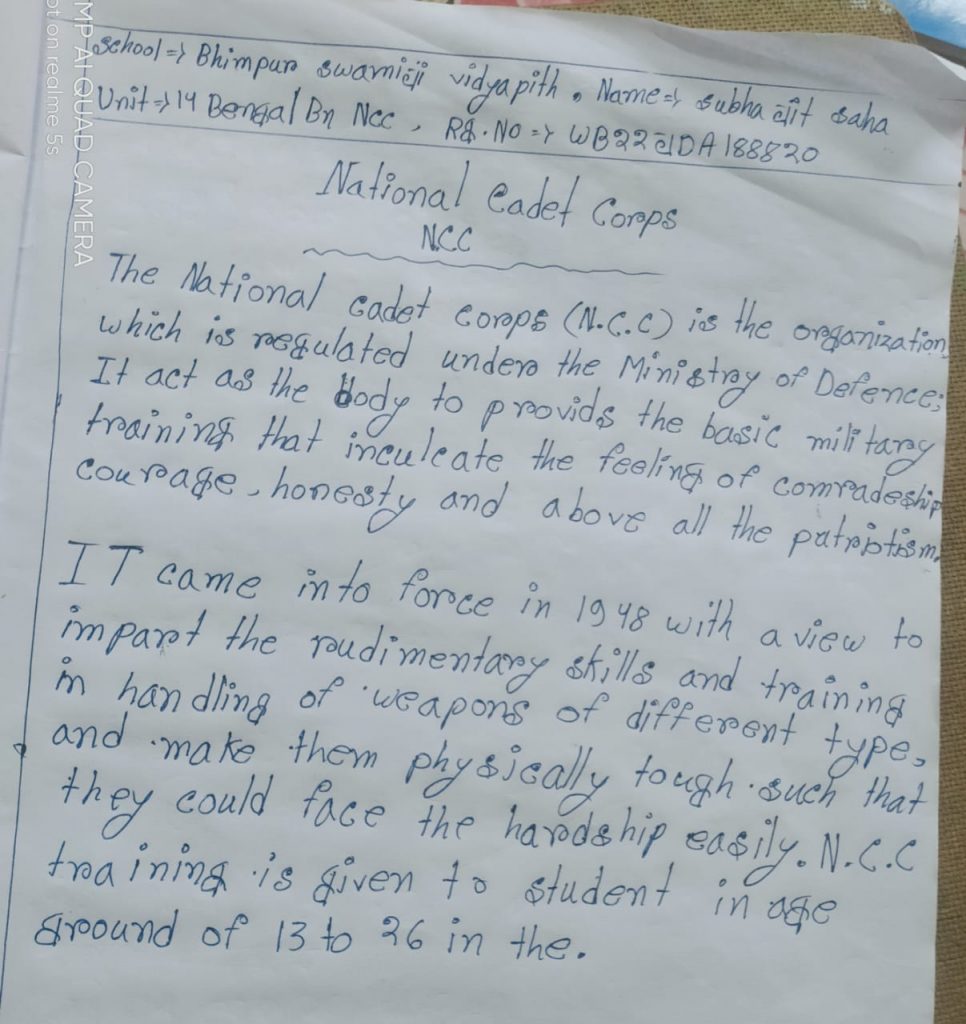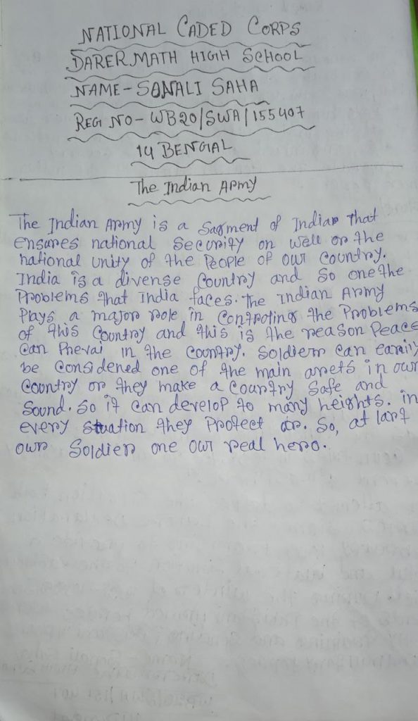 I am a NCC jda cadet of 14 Bengal BN NCC. My Regimental number and name is WB 22jda188820, Subhajit Saha. My school name is Bhimpur Swamiji Vidyapith.