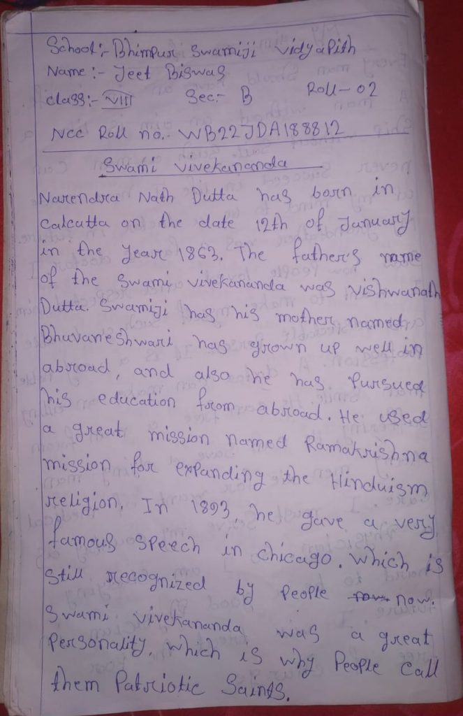 I am a NCC jda cadet of 14 Bengal BN NCC. My Regimental number and name is WB 22jda188812, Jeet Biswas. My school name is Bhimpur Swamiji Vidyapith.