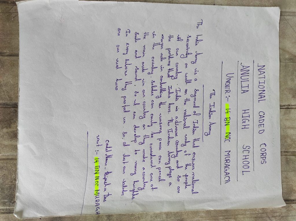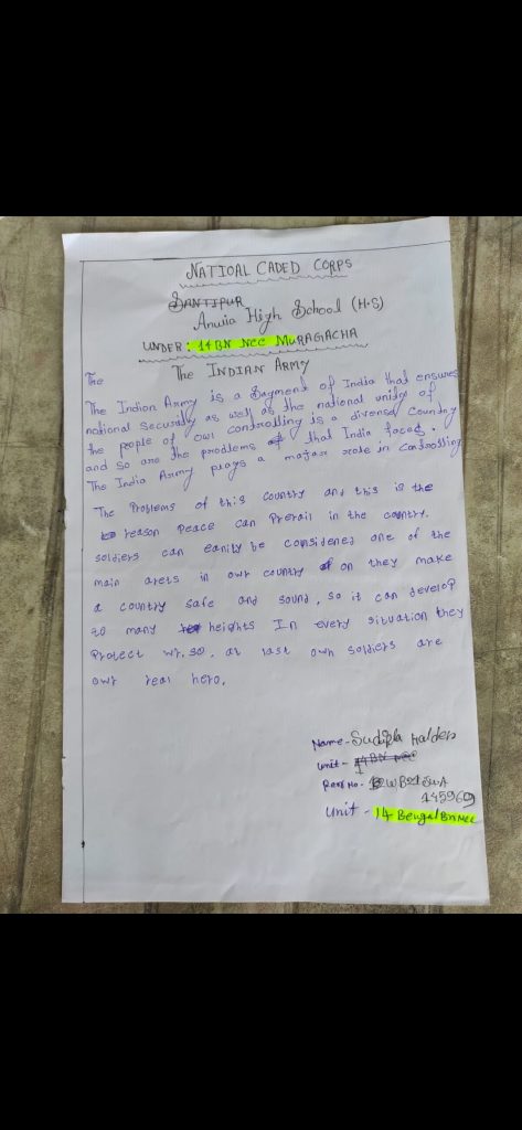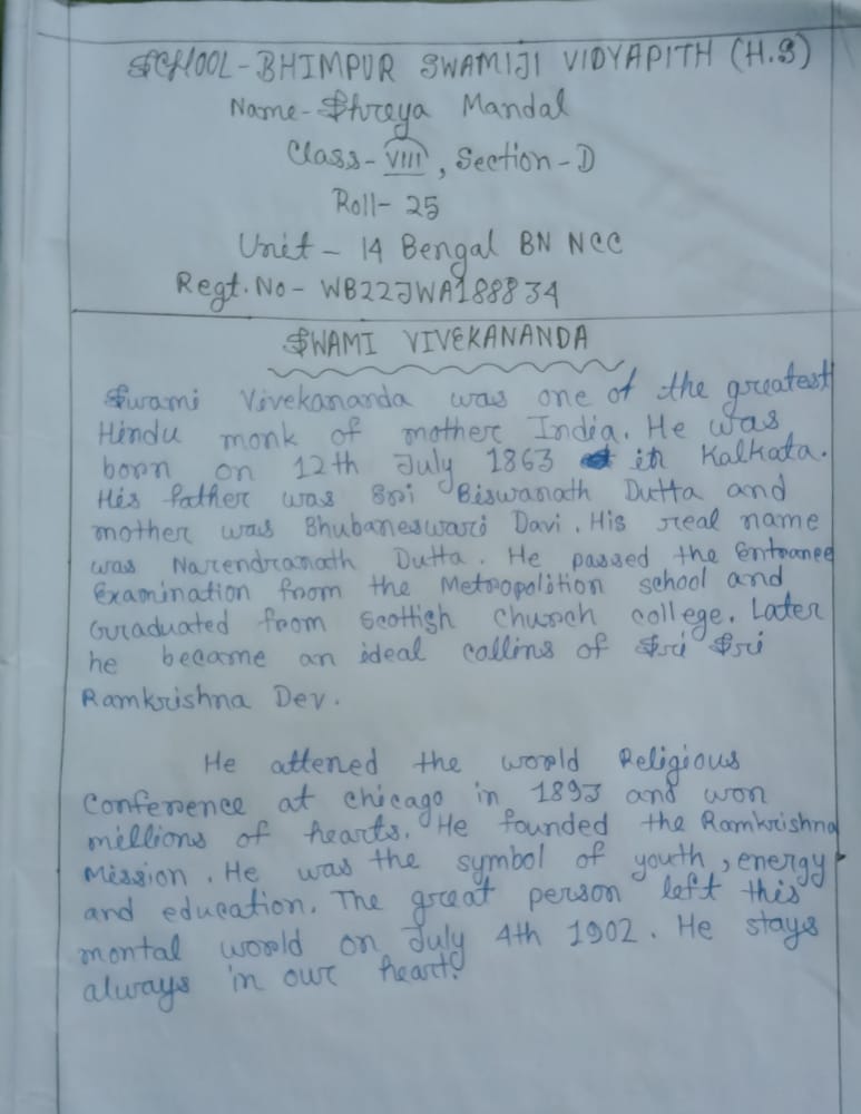 I am a NCC jwa cadet of 14 Bengal BN NCC. My Regimental number and name is WB 22jwa188834 , Shreya Mandal. My school name is Bhimpur Swamiji Vidyapith.