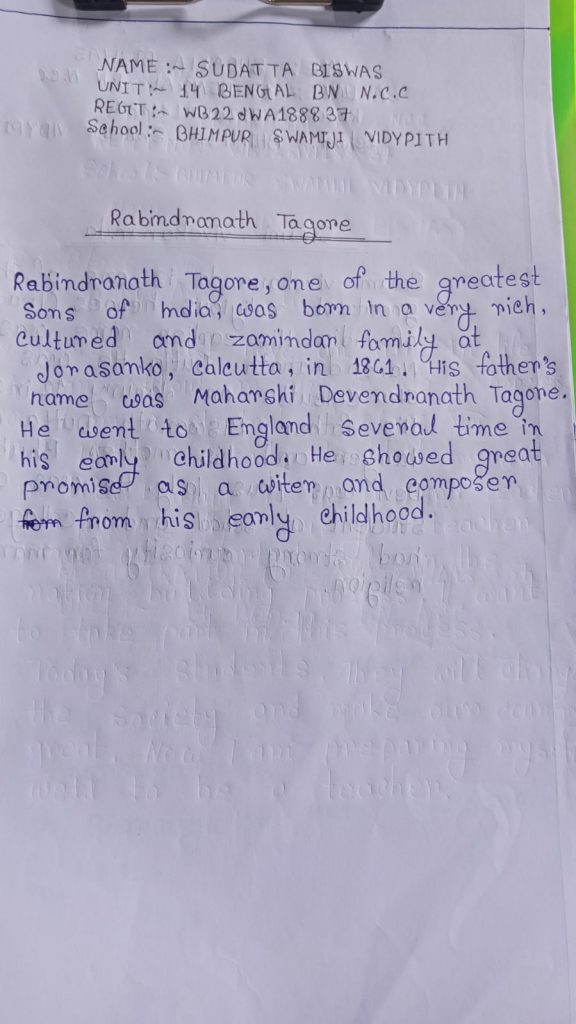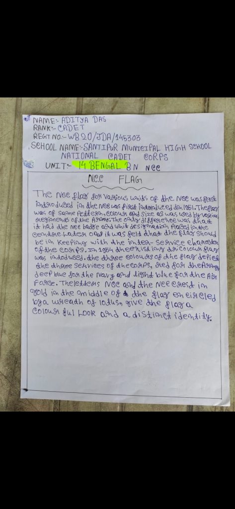 I am a NCC jwa cadet of 14 Bengal BN NCC. My Regimental number and name is WB 22jwa188837 , Sudatta Biswas. My school name is Bhimpur Swamiji Vidyapith