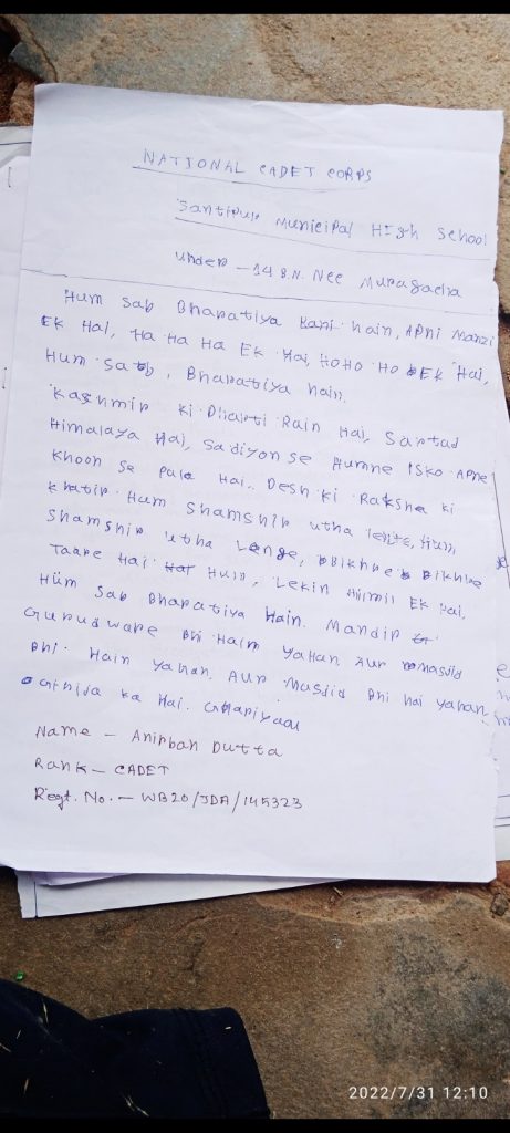 Jay Hind sir , I am Dami Hansda, Rank-CDT, Reg No- WB20SWA/103132, Institution - Sovarani Memorial College.