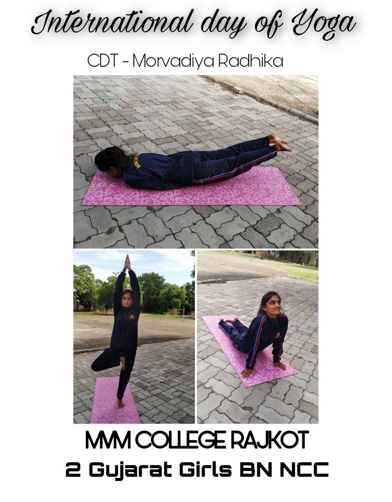 I'm CDT Radhika Morvadiya from MVM college - 2 Gujarat girl's BN NCC Rajkot I did this activity of yoga. Yoga is an activity that includes breathing techniques , yoga poses and mindfulness.