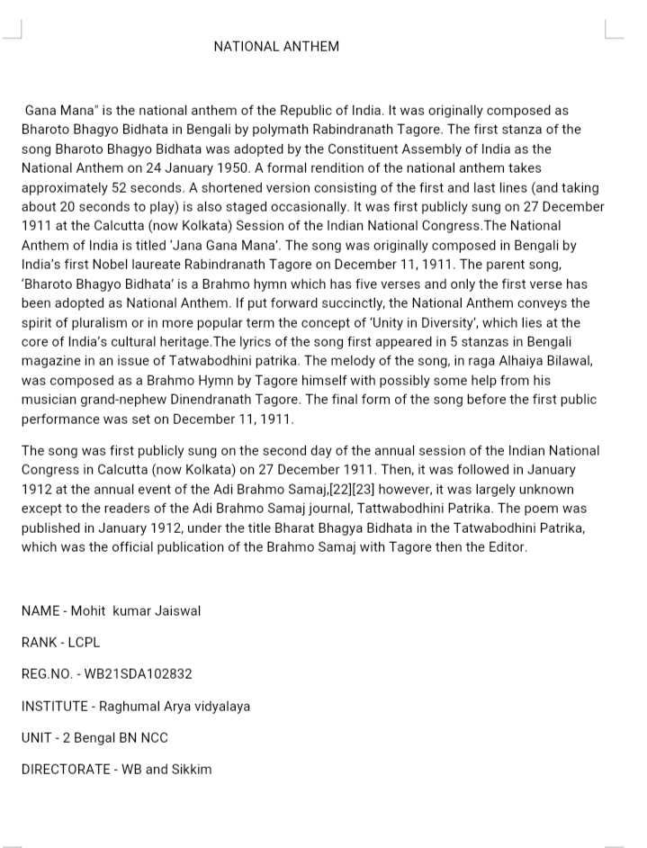 NAME - Mohit kumar Jaiswal RANK - LCPL REG.NO. - WB21SDA102832 INSTITUTE - Raghumal Arya vidyalaya UNIT - 2 Bengal BN NCC DIRECTORATE - WB and Sikkim