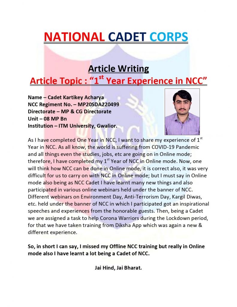 Name – Cadet Kartikey Acharya NCC Regiment No. – MP20SDA220499 Directorate – MP & CG Directorate Unit – 08 MP Bn Institution – ITM University, Gwalior