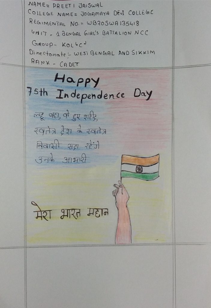 Name- Preeti Jaiswal,College Name-Jogamaya Devi College, Regimental No.-WB20SWA135418.,Unit-1 Bengal Girl's Battalion National Cadet Corps. Group-kol 'C',Directorate- West Bengal and Sikkim Directorate