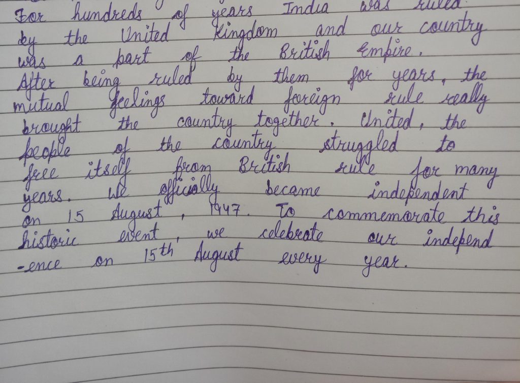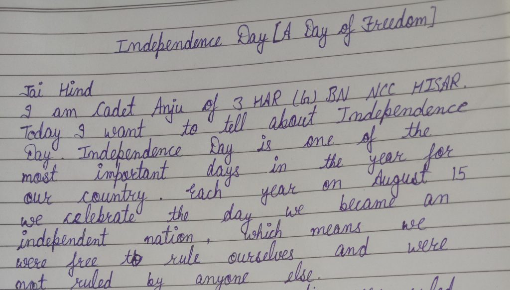 Jai Hind! I am Cadet Anju of 3 HAR (G) BN NCC HISAR of the Rohtak Group of PHHP&C DTE. Today , I want to tell about Independence Day.