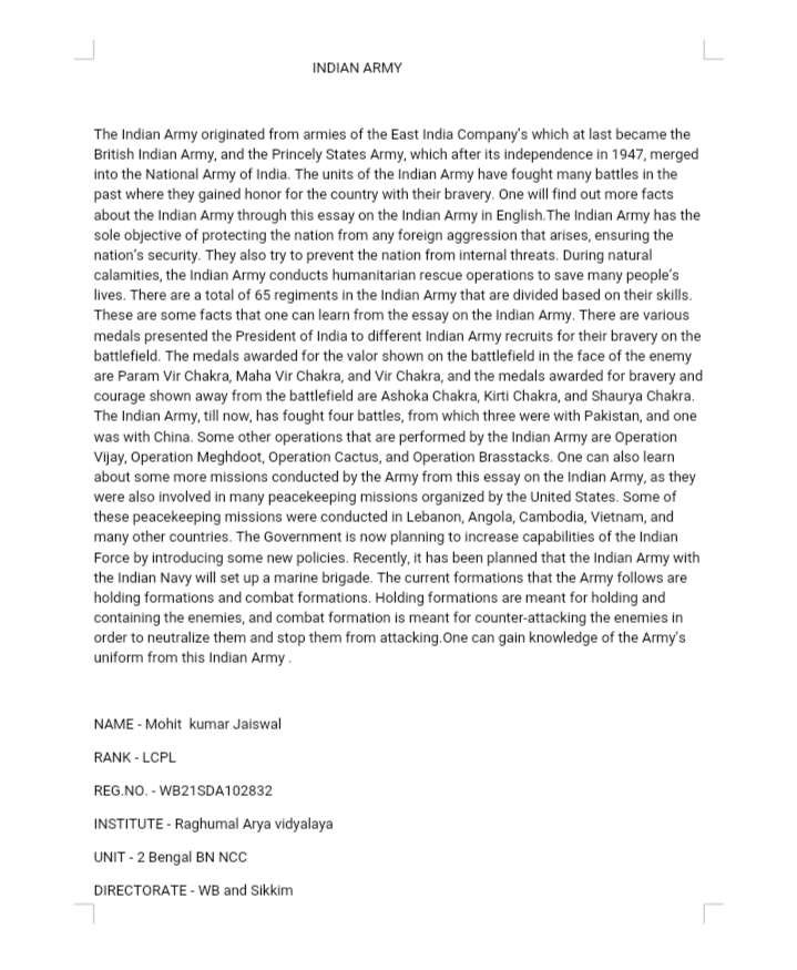 NAME - Mohit kumar Jaiswal RANK - LCPL REG.NO. - WB21SDA102832 INSTITUTE - Raghumal Arya vidyalaya UNIT - 2 Bengal BN NCC DIRECTORATE - WB and Sikkim