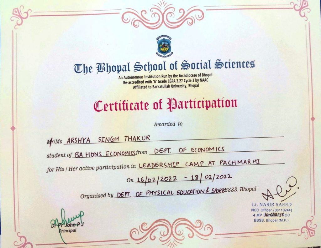 Attended 3 Days Leadership Camp at Pachmarhi organised by Department of Physical Education and Sports BSSS ,Bhopal. Consisting of following activities: Rappelling, Rock Climbing, Horse Riding, Cultural Night, Flag Snatching, Treking -Choragadh.