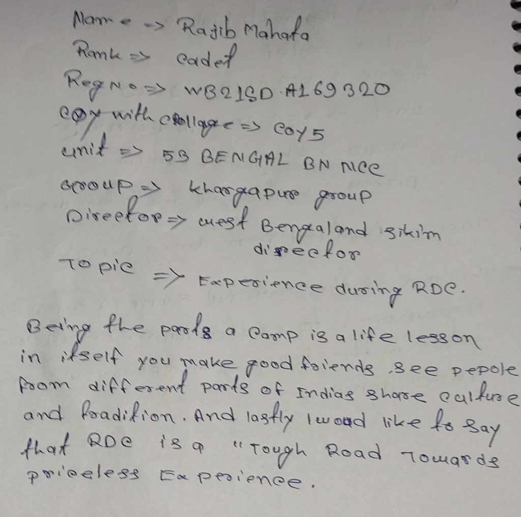 RG NO. - WB19/SDA/156569 RANK - SUO NAME - TUSHAR DEBNATH INSTITUTE - NCP MNHS UNIT - 48 BENGAL BN NCC GROUP - KALYANI