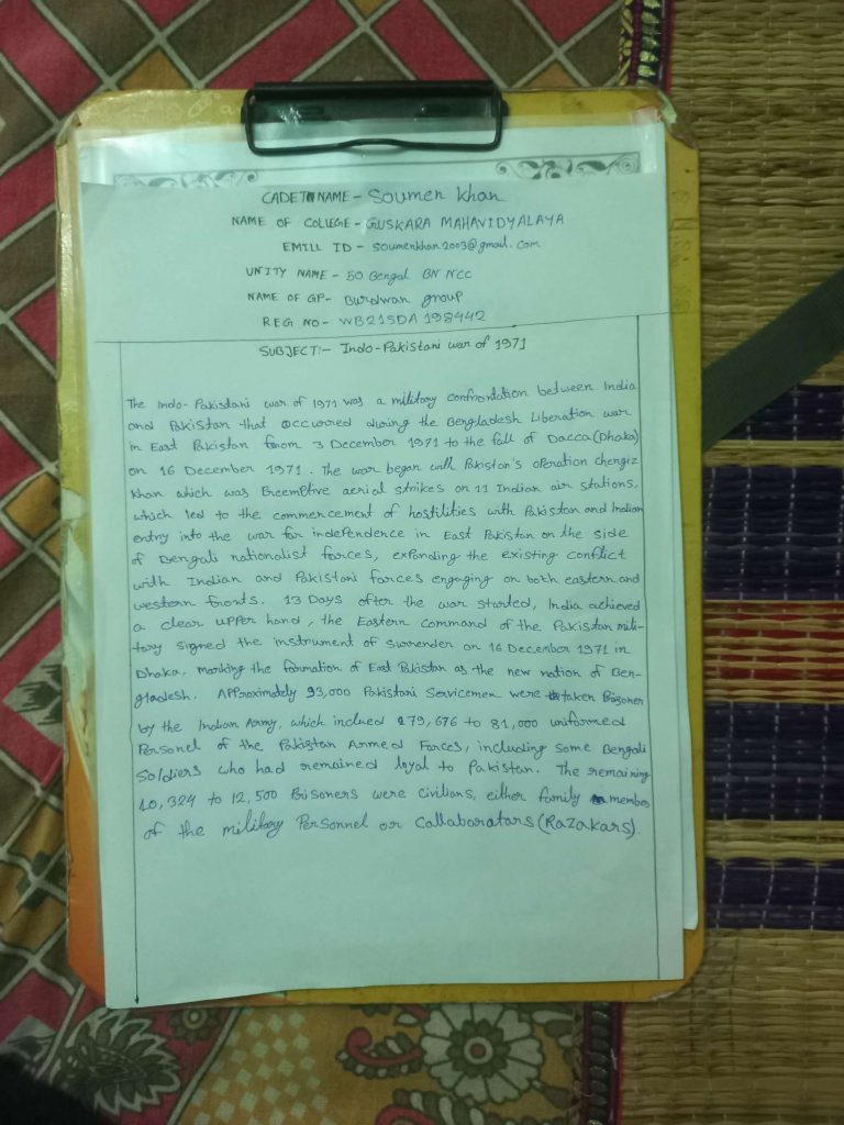 CADET NAME- SOUMEN KHAN GUSKARA MAHAVIDYALAYA UNITY NAME- 50 BENGAL BN NCC GP- BURWAN GROUP REG- WB21SDA198442