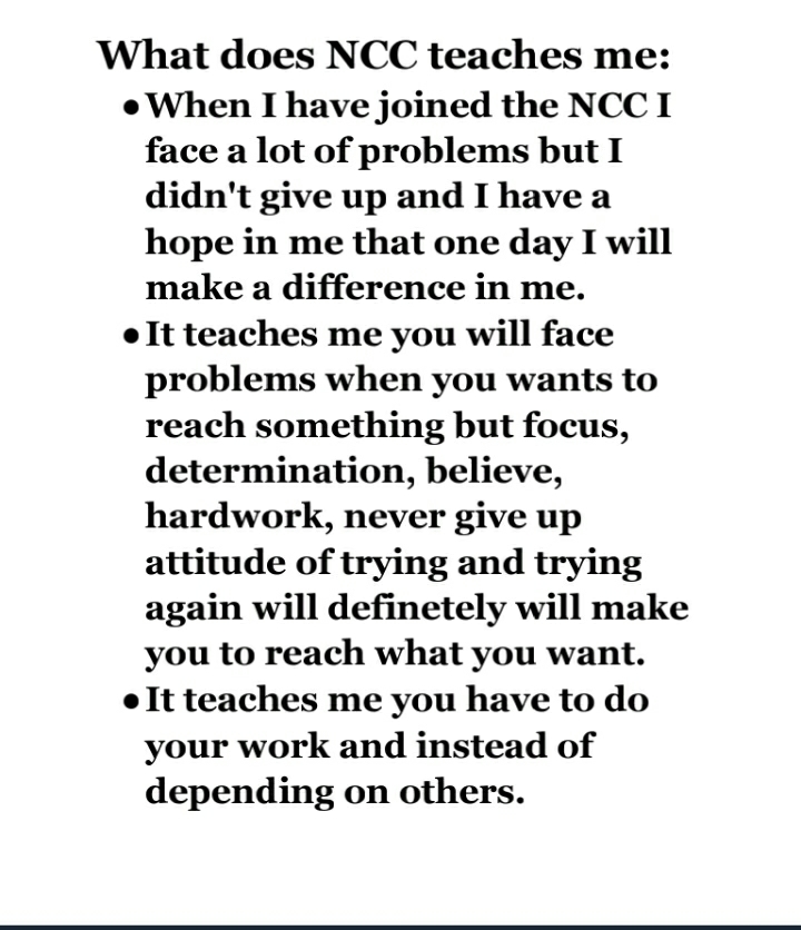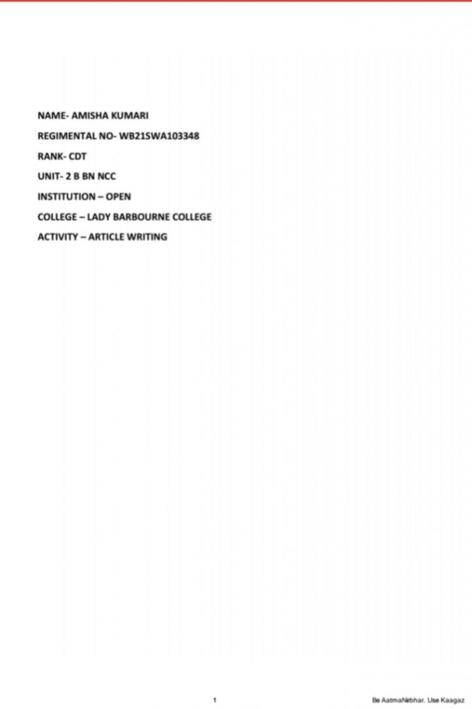 Name- Amisha Kumari Regimental no- WB21SWA103348 Rank- CDT Unit- 2B BN NCC Institution- Open