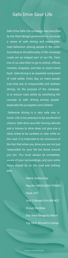 Name- Sudipa Dey Reg No - WB20/SWA/193069 Rank- Cadet Unit- 5 Bengal Girls BN NCC Group- Bardhaman Dte- West Bengal and Sikkim College Name- MUC Women's College Subject - Article on Safe Drive Save life