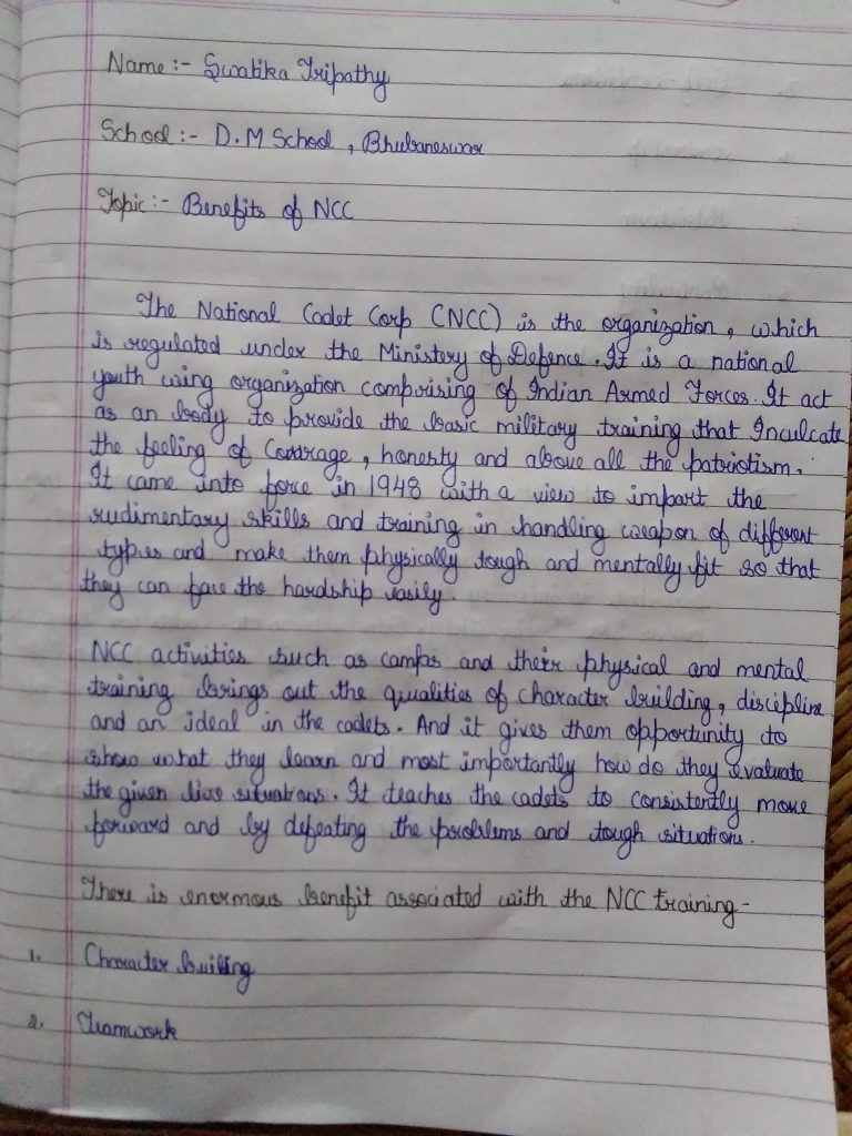 Myself Swatika Tripathy, NCC cadet(ODI20JWA306525),a student of class 9 , DM School BHUBANESWAR, I have deep interest in Study as well as in extracurricular activities like dancing , Art and Craft etc. I love to take responsibility as a leader .